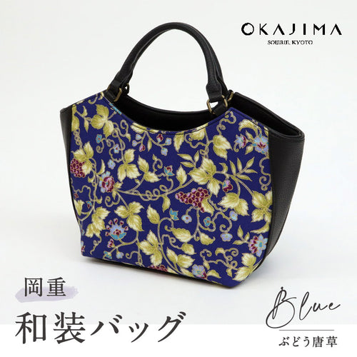 【OKAJIMA 和装バッグ 葡萄唐草】 岡重 京友禅 ブルー ブラック カジュアル ハンドバッグ かばん 唐草模様 上品 バック 手提げ 着物 小紋 訪問着 付下げ イベント 和装 洋服 お出掛け 和装小物