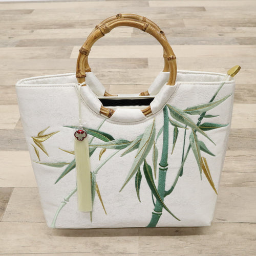 【未使用品】和装バッグ ホワイト 刺繍 竹と笹の葉 バンブー竹ハンドル 白 着物に合わせ z7-15 リサイクル着物 訪問着 付下げ 結婚式 披露宴 パーティ 式典 祝事 お宮参り リユース 古着 アウトレット