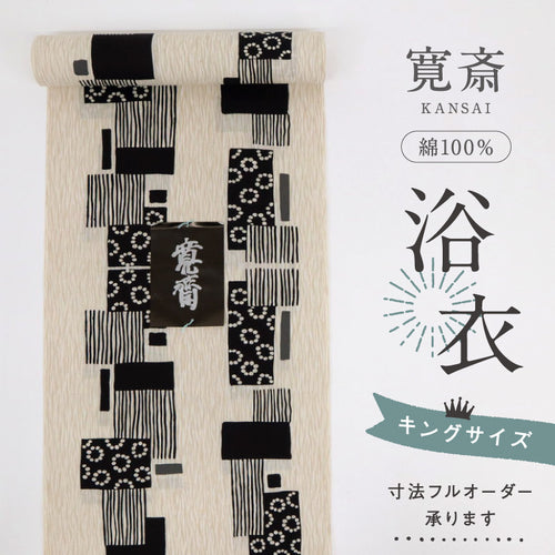 浴衣反物『Kansai』山本寛斎 寄せ柄四角のライン グレージュ 黒紺 夏着物 カジュアル 木綿 反巾40cm 反25-137