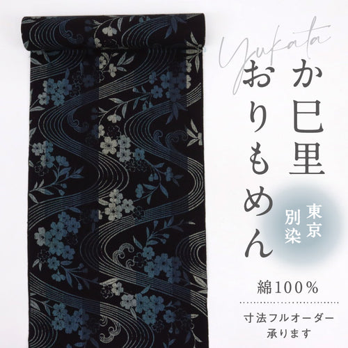 浴衣反物『か巳里おりもめん』流水にさくらの花 紺 夏着物 カジュアル 長さ11.8m 反巾37.5cm 反25-133