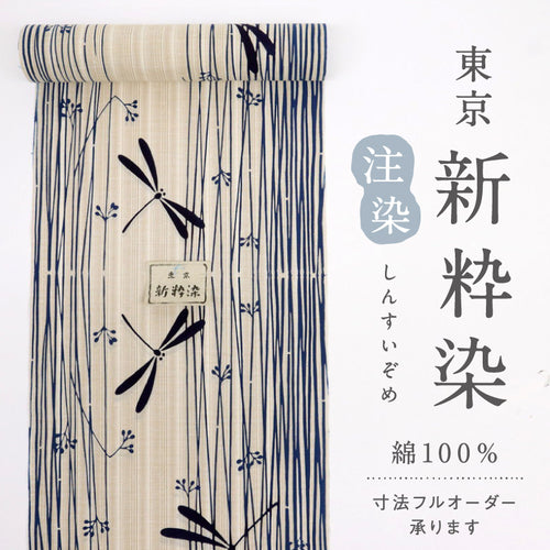 浴衣反物 東京『新粋染』茶紬地 とんぼにフトイの風景 ベージュ 紺 カジュアル 綿着物 反巾39cm お仕立て可 反25-47