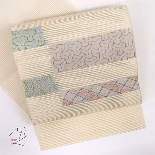 【中古】夏帯『紗』開き仕立て名古屋帯 煌びやか熨斗模様 カジュアル 白地 長さ372cm 帯巾31cm 正絹着物 NS7-38