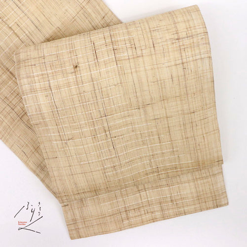 【新品】夏の麻『長沙上布』名古屋帯 スクイ手織り 横段 カジュアル 生成り色 長さ378cm 帯巾30.5cm 着物 NY5-43