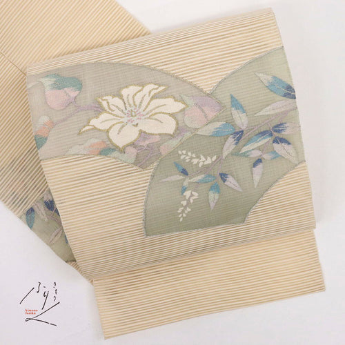 【新品】名古屋帯 シンプル 煌びやか花唐草模様 カジュアル 白 長さ357.5cm 帯巾30.5cm 正絹着物 NS5-40