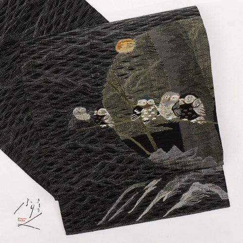 【未使用】夏の袋帯 月夜のふくろう よろけ織り フォーマル 略礼装 黒地 長さ441cm 帯巾31cm 正絹着物 FB12-8