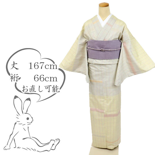 【中古】長尺 紬 訪問着 横段 細やか格子柄 浅黄色 カジュアル 身丈167cm 裄丈66cm 袷正絹着物 TY10-1