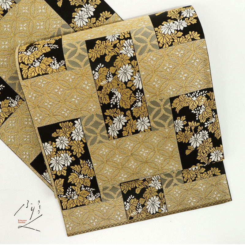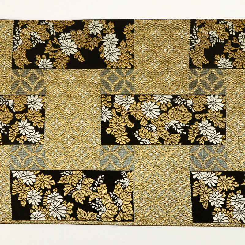 黒地に輝く煌びやかな七宝繋ぎ、色紙には菊や桐の花模様が織り成され、趣きを感じる古典的なデザイン。