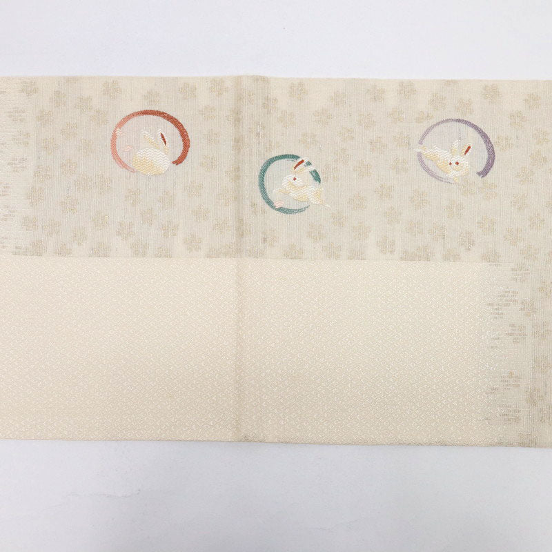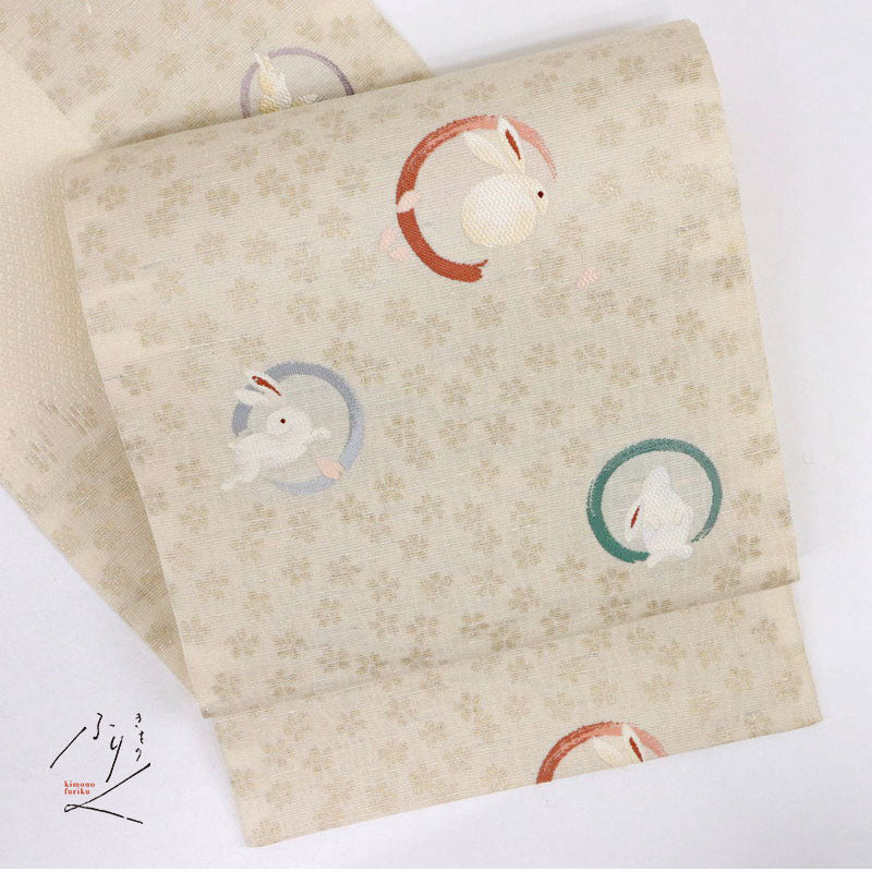 パステルカラーの丸文に愛らしいうさぎの姿と