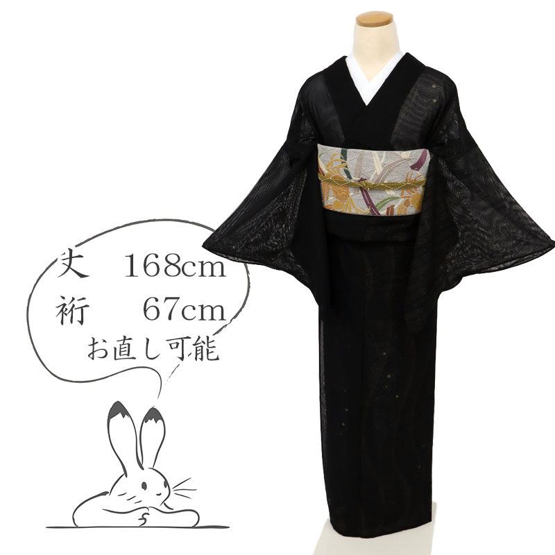 商品番号: 中古-長尺-希少-紗袷-小紋-角散らしのゆらぎと植物の縞-カジュアル-黒-身丈168cm-裄丈67cm-正絹着物-sb8-3