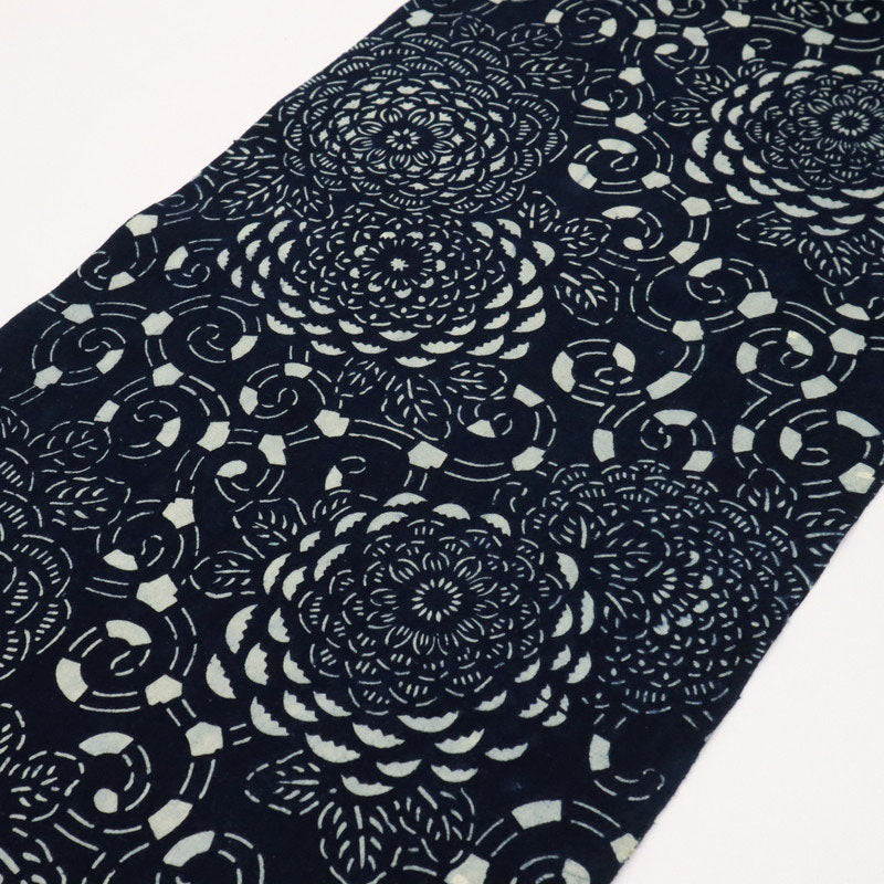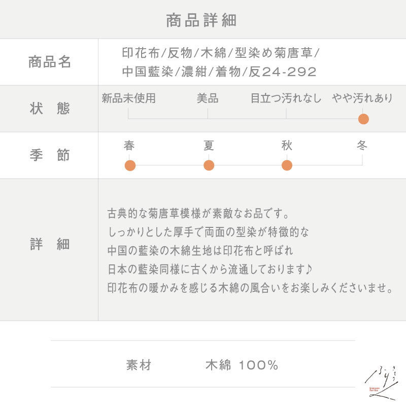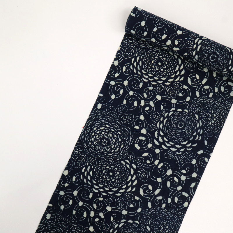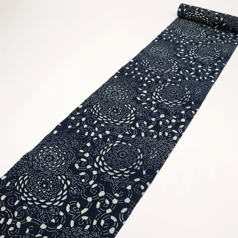 商品番号: 印花布-反物-型染め菊唐草-中国藍染-濃紺-木綿-長さ10-3m-反巾37-5cm-カジュアル-お仕立て可-和装-きもの-木綿着物-反24-292