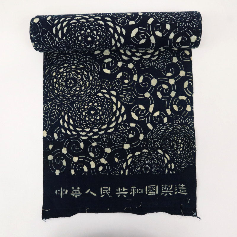 印花布 反物 型染め菊唐草 中国藍染 濃紺 木綿 長さ10.3m 反巾37.5cm カジュアル お仕立て可 和装 きもの 木綿着物 反24-292