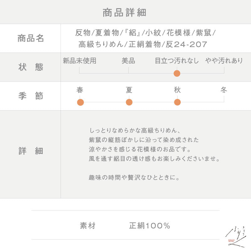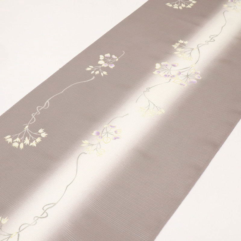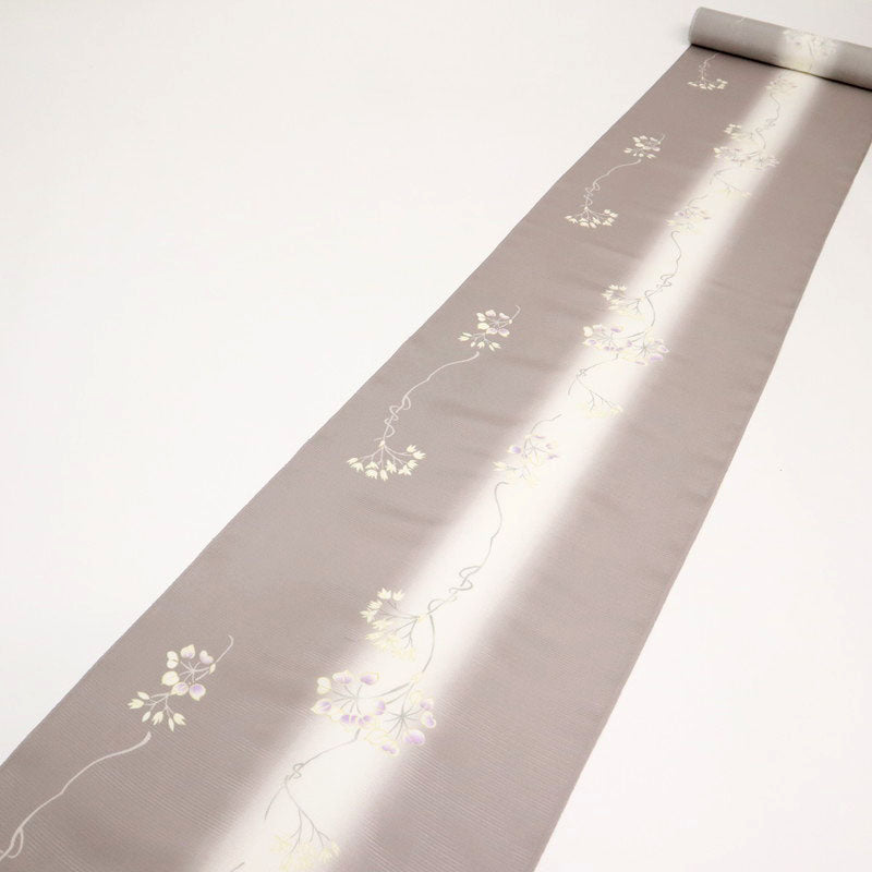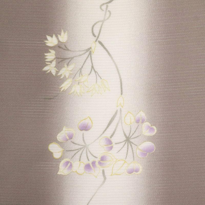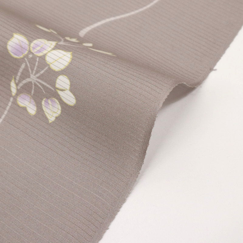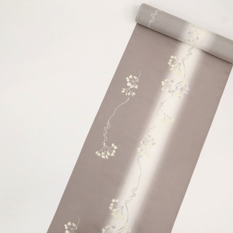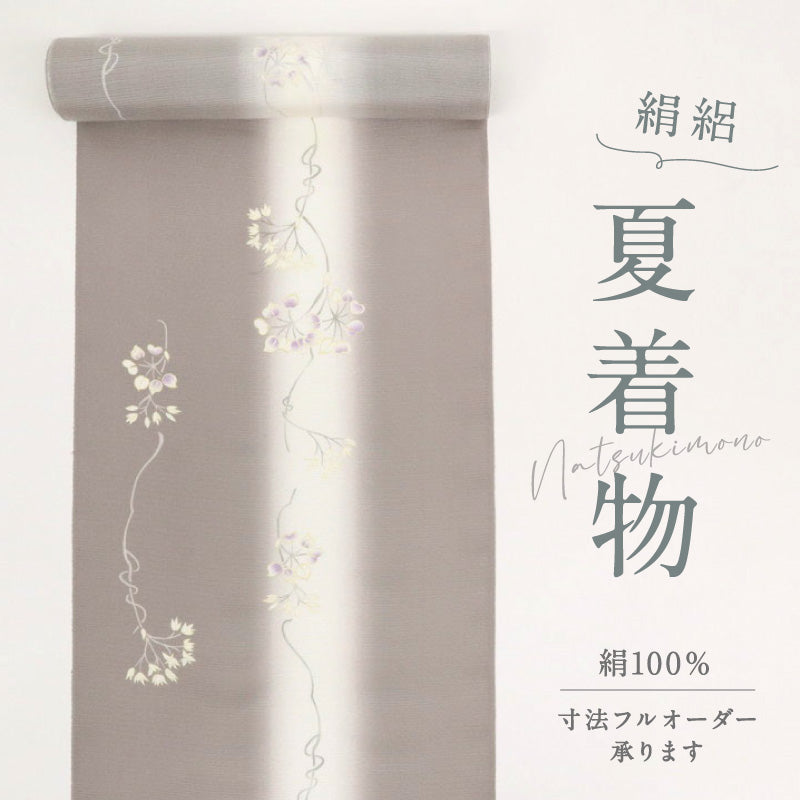 しっとりなめらかな高級ちりめん、紫鼠の縦筋ぼかしに沿って染め成された涼やかさを感じる花模様のお品です。風を通す絽目の透け感もお楽しみくださいませ。