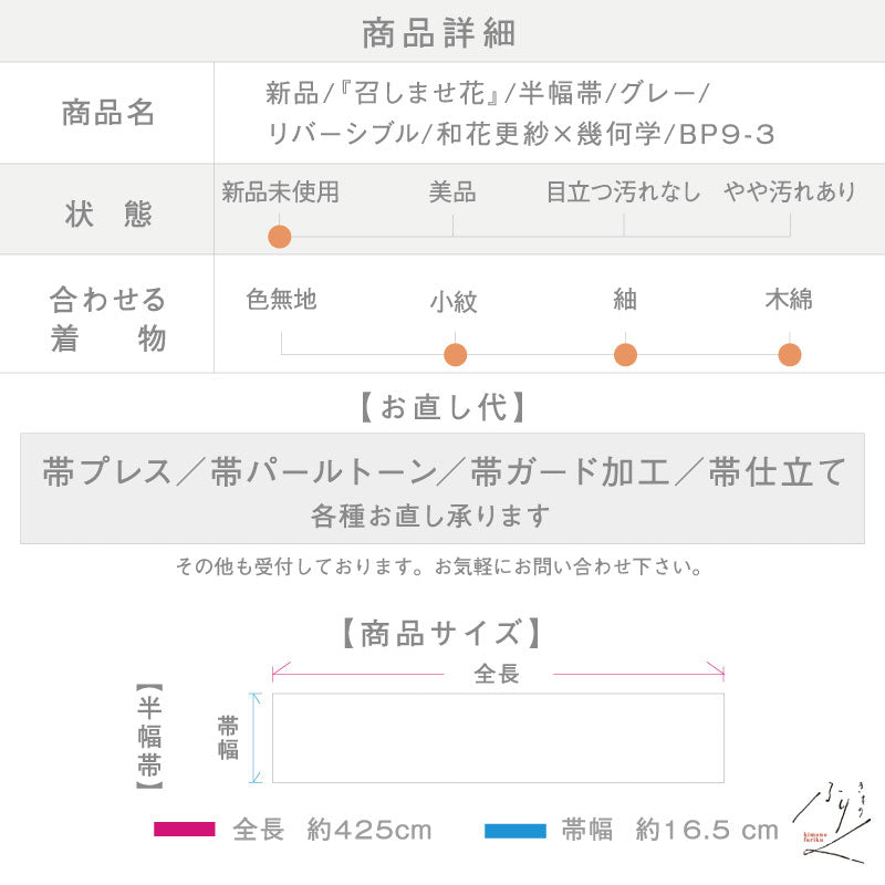 商品番号: 新品-半幅帯-召しませ華-和花更紗a-リバーシブル-唐草模様-パープル-グレー-長さ425cm-帯巾16-5cm-絹-半巾帯-細帯-和装小物-きもの-カジュアル-街着-お稽古着-普段着物-小紋-紬-召しませ花-bp9-3