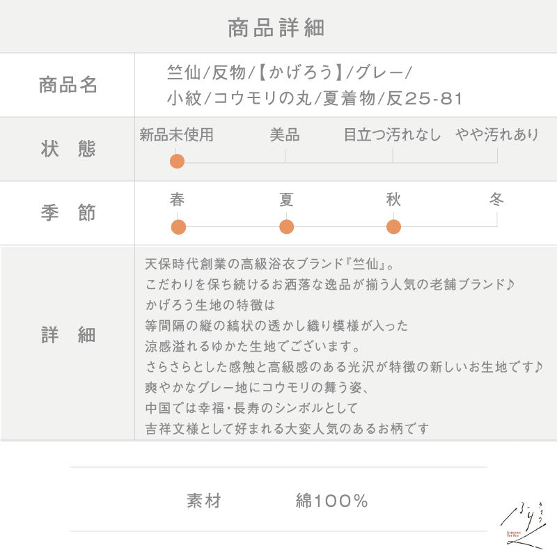 商品番号: 新品-竺仙-かげろう-浴衣反物-小紋-コウモリの丸-グレー-カジュアル-長さ12-9m-反巾40cm-お仕立て可能-木綿夏着物-和装-きもの-反25-81