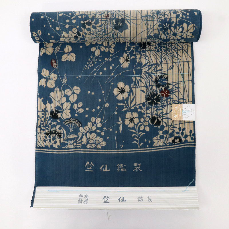 新品『竺仙』2025年新作 奥州小紋 浴衣反物 格子秋草 ベージュ 紺 カジュアル 長さ12m 反巾38cm お仕立て可能 木綿夏着物 和装 きもの 反25-13