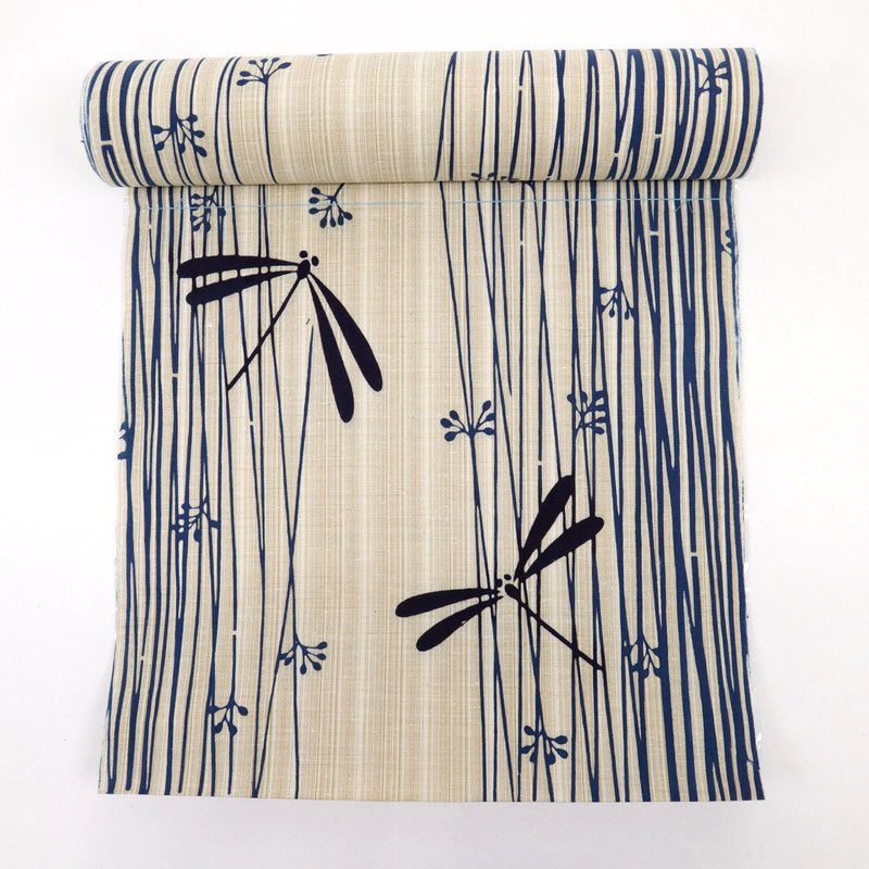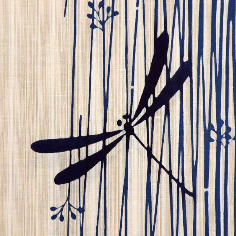 とんぼが水辺のフトイの合間を飛ぶ姿。